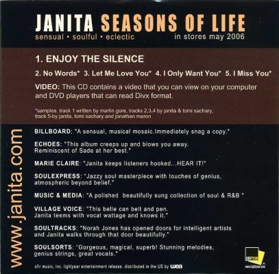 Contains Enjoy The Silence as full track, 4 album tracks as samples, and a DivX video for PCs. Extremely rare promotional DVD with EPK video, infos and slideshow. Not just another cover version of ‘Enjoy The Silence’, this is maybe the most beautiful cover of ETS ever! This Japanese edition has a very nice booklet with lots of gorgeous pictures from Janita’s press photo shooting. This release is probably the only CD format featuring the “Nuspirit Helsinki Remix”. This nice Taiwanese edition with DVD comes in fat deluxe jewel case. The DVD contains the EPK, a slideshow and a music video of the song “I Miss You”. Sensual, soulful, eclectic – and allow me the remark: I guess these famous lyrics have never before been formed by such beautiful lips! Just visit her website, watch and listen to the video and see and hear for yourself… The album includes a 16-piece string orchestra consisting of musicians from the NY Philharmonic, and her band includes many of New York’s top musicians.